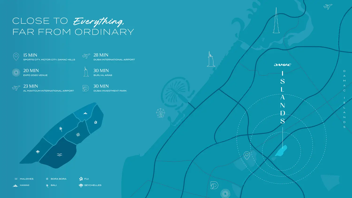 Experience the ultimate island lifestyle at DAMAC Islands, Dubai’s premier luxury waterfront community inspired by six of the world’s most stunning tropical destinations! This exclusive retreat features a collection of luxurious Towns & Villas, nestled among serene lagoons, lush jungle rivers, and thrilling water adventures. Ideally located near the Al Maktoum International Airport—the world’s largest in development—DAMAC Islands offers seamless connectivity to Downtown Dubai, Dubai Marina, and beyond. Crafted for those who crave tranquility and refined living, this masterfully designed paradise redefines waterfront luxury with world-class amenities and breathtaking surroundings.